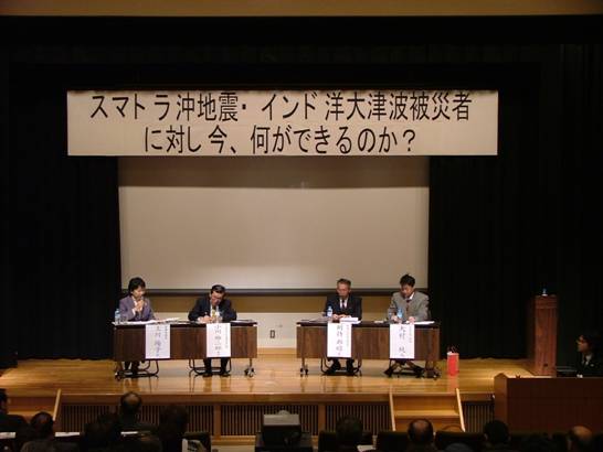 パネルトーク:スマトラ沖地震・インド洋大津波――被災者に対し今、何ができるのか?――2005 年 2 月 13 日 先日のスマトラ沖地震・インド洋大津波で被災された皆さんへの救援を訴え、あわせて今回の大災害から私たち静岡市民が教訓を学ぶため、きょう静岡県地震防災センターでパネルトークを開催しました。 はじめに津波発生直後、スリランカを現地調査された富士常葉大学防災環境学部の小川雄二郎先生が生々しい映像をもとに現地の状況をご報告くださいました。先生はアジア地域の防災協力を推進する「アジア防災センター」の所長も務められた防災の専門家です。その後、 3 人のパネラーにそれぞれのお立場で大変参考になるご経験やお考えをお話いただきました。 会場には 150 名の皆さんが参加されましたが、パネラーとの間で熱心に質疑応答・意見交換する場面もみられました。なお津波被災者への救援募金をお願いしたところ、 8 万円に上るご協力をいただきました。この場をお借りしてお礼申し上げます。誠にありがとうございました。 ●パネラー :富士常葉大学・防災環境学部教授 小川 雄二郎 先生 :静岡市消防団・副団長 剣持 邦昭 氏 : 大村医院 ・ 院長 大村 純 氏 ●コーディネーター :衆議院議員 上川 陽子