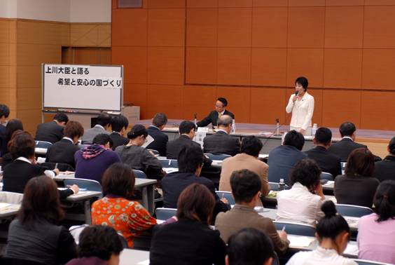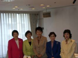 女性知事4人と女性の人材登用やこれまでの少子化対策の評価などについて意見交換。北海道の高橋知事、千葉県の堂本知事、滋賀県の嘉田知事、熊本県の潮谷知事が出席(大阪市)