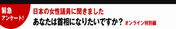 いよいよポスト小泉レースが本格派。でも、首相候補には男性の名前ばかり。女性の名前が全く取り沙汰されないのは、寂しくもあり、不自然な気もする。海外では女性の首相、大統領が次々誕生し、昨年はドイツでも初の女性首相にアンゲラ・メルケルが就任。アメリカでは、次期大統領の最有力候補にヒラリー・クリントンの名前が挙がっているというのに。(中略)初の女性首相誕生なんて、まだまだ遠い先の話? そこで現役の女性国会議員へのアンケートを試みた(衆参合計
