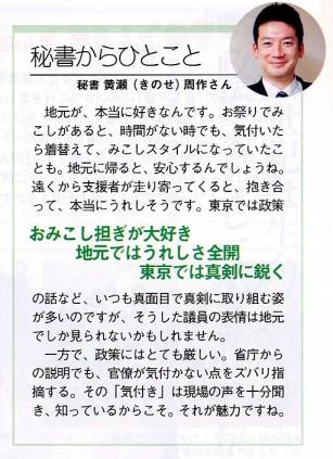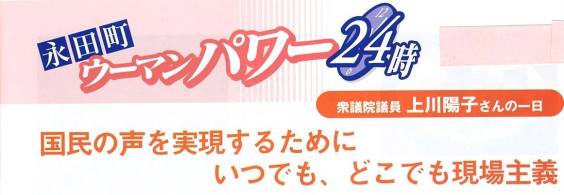 多忙な一日の始まりはエコ・ウオーキングから 上川さんの起床は、6時30分から7時の間。新聞やテレビのニュースをチェックし、赤坂の議員宿舎を出るのは7時40分頃。毎日ではありませんが、マラソンへの挑戦と健康のため、永田町の党本部まで、上川さんいわく「エコ・ウオーキング」。朝食はほとんど党の部会でとります。 この日は、8時の党内閣部会・青少年特別委員会合同会議への出席から活動開始。9時から衆議院厚生労働委員会で大臣所信を聞き、10時には党政務調査会審議会に。続けて党の行政改革推進本部役員会、農業基本政策小委員会の勉強会に出席し事務所へ。昼食は大好きな野菜たっぷりの五目ラーメンです。 午後は13時からの本会議に出席。その後、前日開催の「上川陽子君を励ます会」のお礼を兼ねてあいさつ回り。 初代・担当大臣として公文書管理への取り組み 16時30分に内閣官房公文書管理検討室から、公文書管理に係る提出法案の説明を受けました。上川さんは、昨年2月、初代・公文書管理担当大臣に就任し、8月に退任するまで公文書管理の仕組みづくりに取り組みました。19の府省庁の行政文書の管理状況を自分の目で確認した上川さんは、文書管理の統一ルールが確立していないこと、また公務員自身の管理意識の希薄さを指摘します。「年金記録問題は、文書管理の曖昧さに原因」と上川さん。立法、司法、行政の三権の文書を記録としてきちんと保存・管理することは、民主主義の土台であり、国民への責務と語ります。本来、日本は7世紀後半の律令制の頃から文書を記録し、大切に残してきた。だから歴史が今に継承されている。ところが戦中・戦後を経てそうした文化・風土が失われてしまった。上川さんは語ります。「公文書管理は、古来、日本が培ってきた良い制度を現代に蘇らせればいいのです。公の仕事を記録として残し、利活用できるように公文書を管理することは、行政改革の大きな柱の一つです」と。 また、上川さんは、地元での活動をとても重視しています。そのために、地元の人と直接触れ合い、対話を通じて地域に暮らす人々の声を積極的に聞くようにしています。「職場でも家庭でも、現場で生きる方々に頑張ってもらえるようサポートをする、それが政治の大きな仕事」と考える上川さんは、今「女性と健康」をテーマに地元での対話を進めています。地元での講演に備えて17時30分から資料を作成。その後、同期や若手議員らとの懇談や交流、大臣の時にサポートしてくれたスタッフの労をねぎらい、地元、静岡に向かったのは22時。自宅でのつかの間のくつろぎタイムで明日への英気を養い、就寝したのは24時でした。