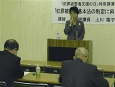 NPO法人静岡犯罪被害者支援センター(松井純理事長)は「犯罪被害者支援の日」の三日、静岡市黒金町の静岡労政会館で特別講演会を開いた。自民党犯罪被害者保護基本法案プロジェクトチーム事務局長の上川陽子衆院議員(比例東海)が「犯罪被害者基本法の制定に向けて」をテーマに講演した。